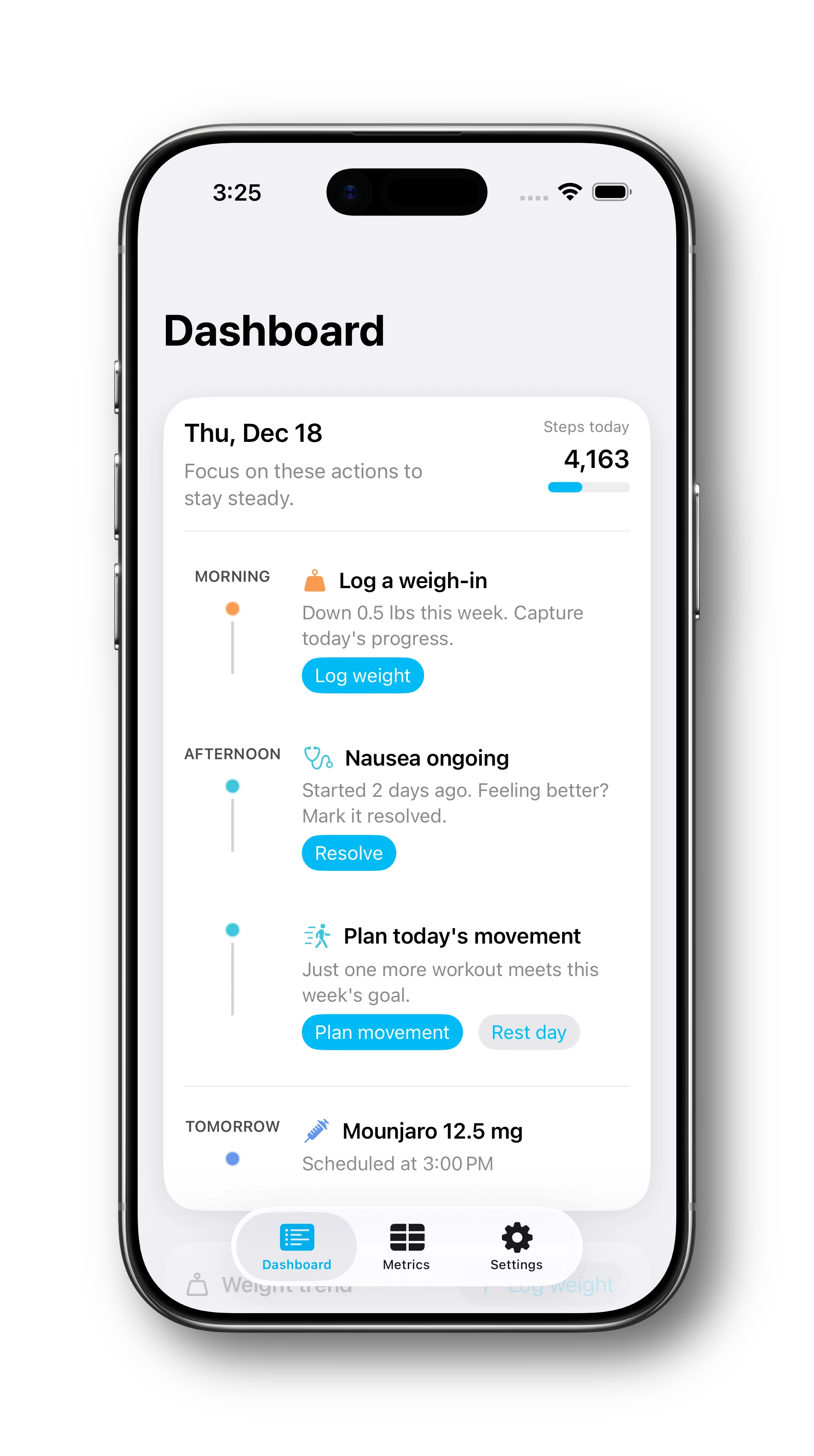Watch your journey unfold with weight trends and activity streaks. Celebrate the wins, learn from the patterns, and stay motivated for the long haul.